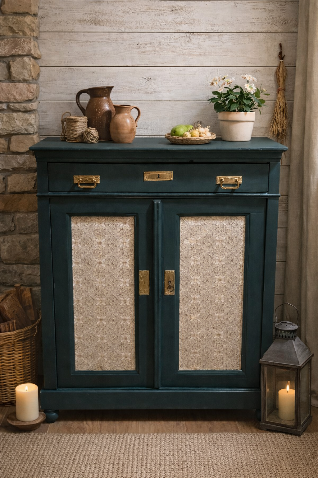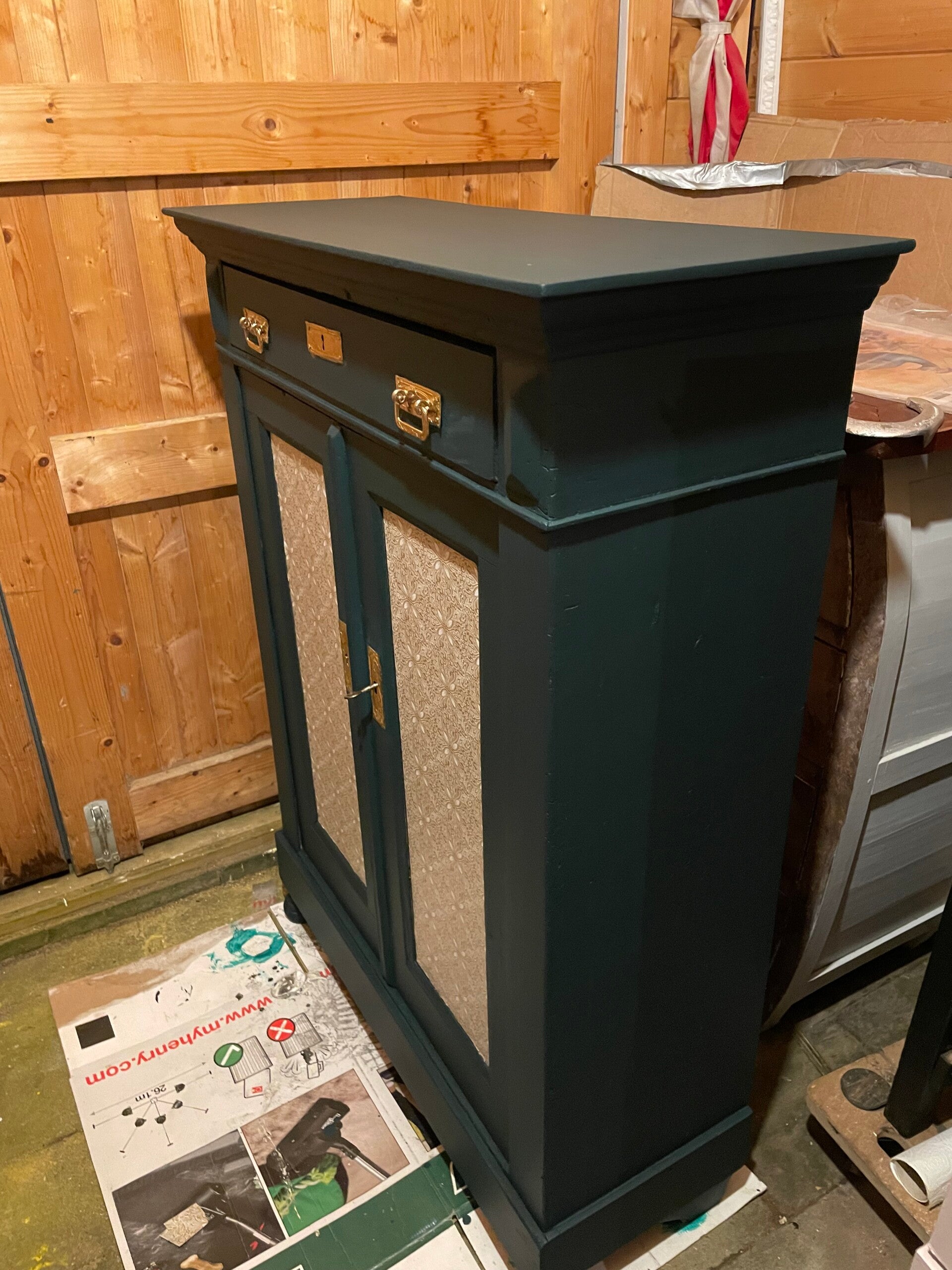 Prachtig vintage kastje in een diepe teal/groenblauwe kleur met mooie messing handgrepen en sleutelplaatjes. Een echte eyecatcher in een landelijk, brocante of modern interieur.