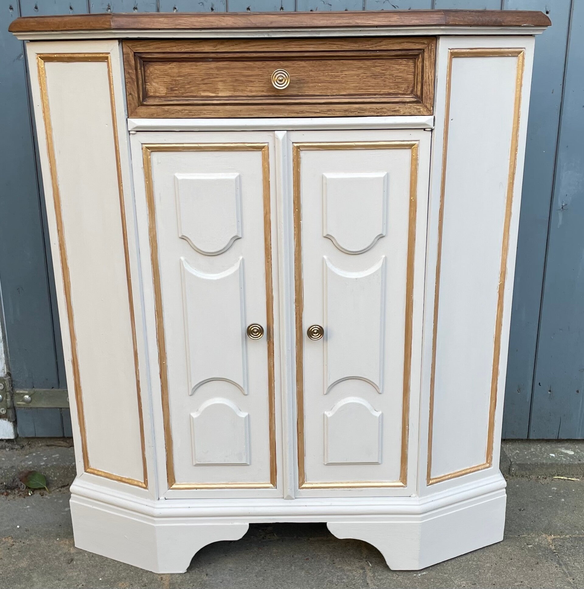 Een bijzonder elegant kastje met een verfijnde landelijke uitstraling. Dit meubel combineert een zachte, warme crèmetint met natuurlijke houten accenten en een prachtig doorleefd blad, wat zorgt voor een stijlvolle en tijdloze uitstraling.