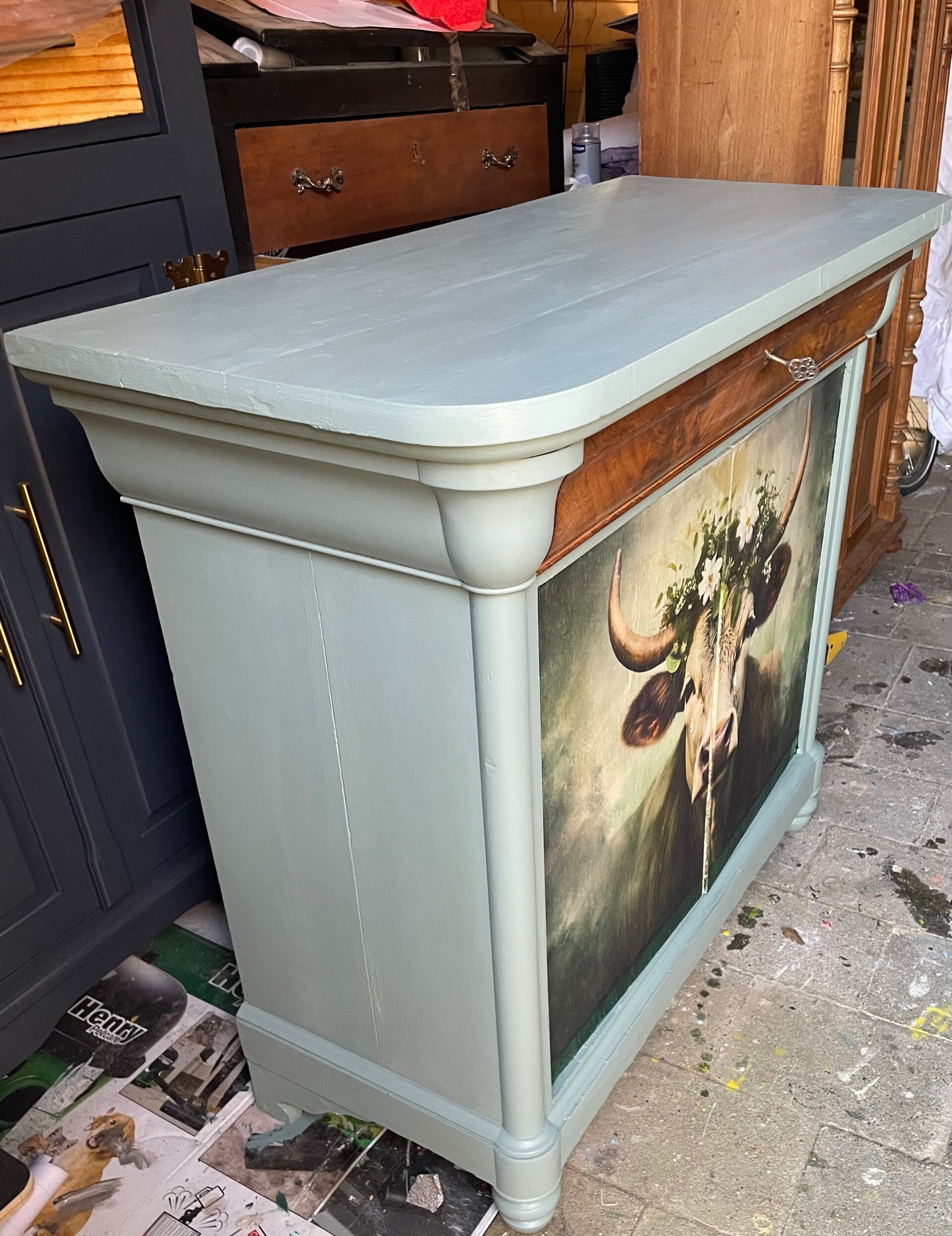 De deuren zijn voorzien van een prachtige decoupage van koe “Bessie”, wat het meubel een warme, rustieke uitstraling geeft.